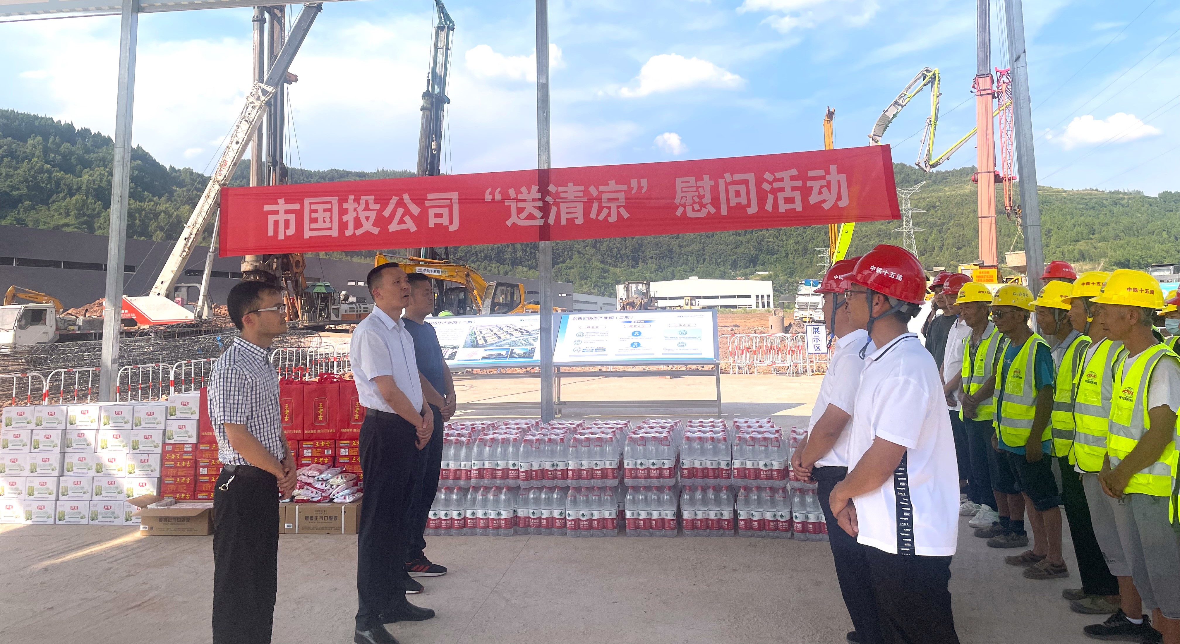 为全力做好项目一线防暑降温工作,切实保障职工、工友生命安全和身体健康,扎实开展“我为群众办实事”实践活动。8月16日下午,市国资管理公司党支部书记、执行董事,市国投公司执行董事谢维带队赴东西部协作产业园及基础设施(一期)建设项目现场开展“送清凉”慰问活动。公司副总经理刘恩韬、各部门(室、中心)负责人及工会相关人员参加。