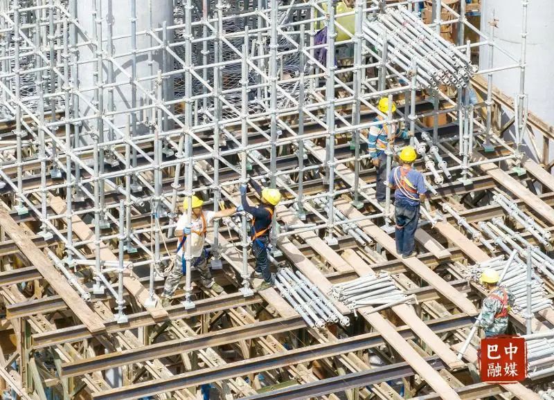 工人正在安装施工钢架。