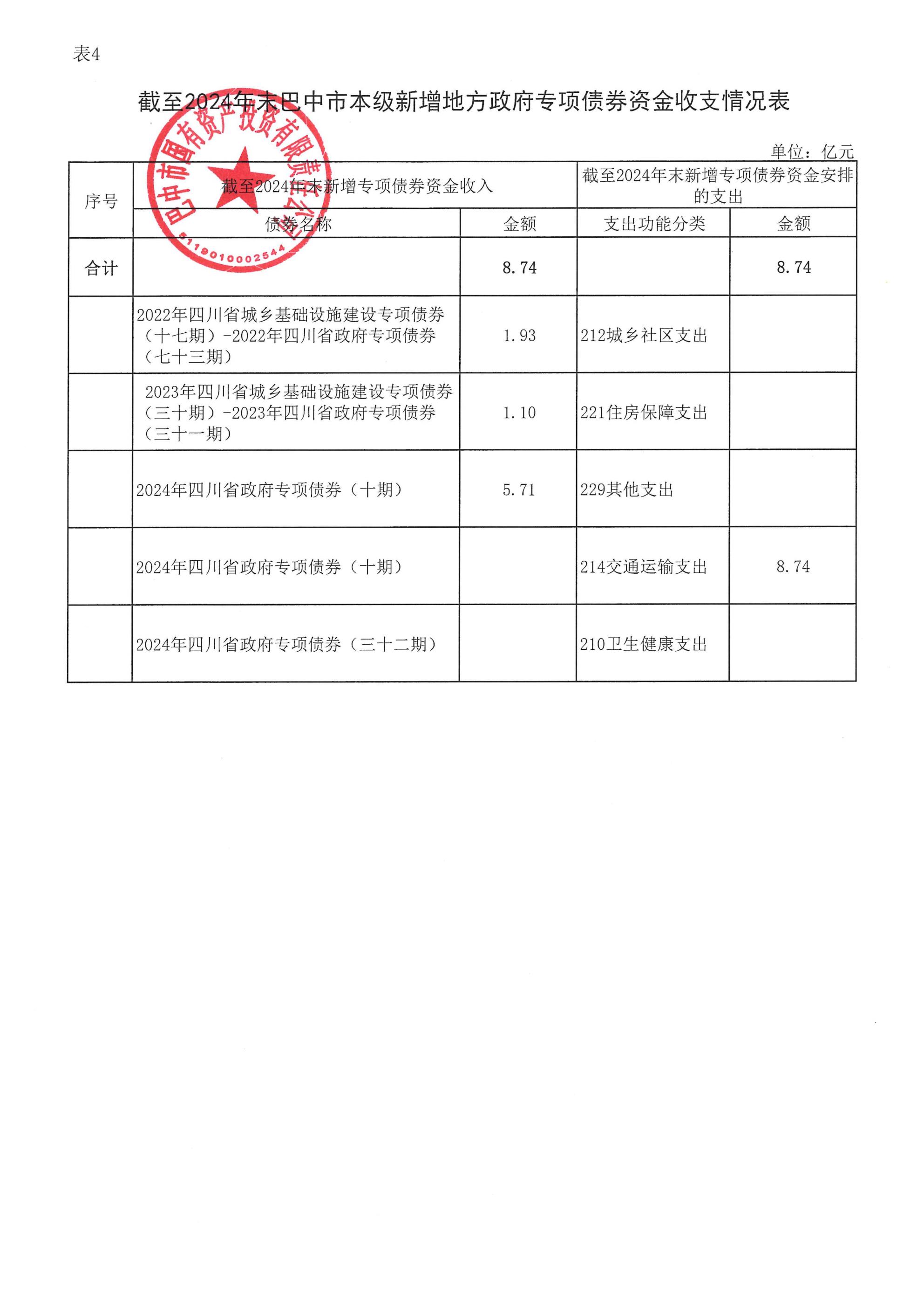 截至2024年末巴中市本级新增地方政府专项债劵资金收支情况表