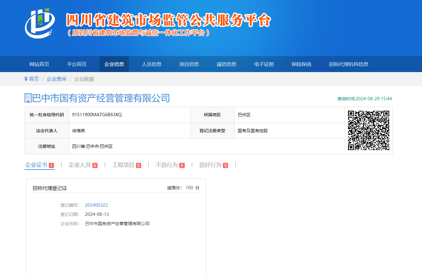 2024年8月13日,巴中市国有资产经营管理有限公司在四川省建筑市场监管公共服务平台顺利通过审核,并成功取得招标代理资格。市国资经营公司作为全市专业从事国企阳光采购、招标代理的